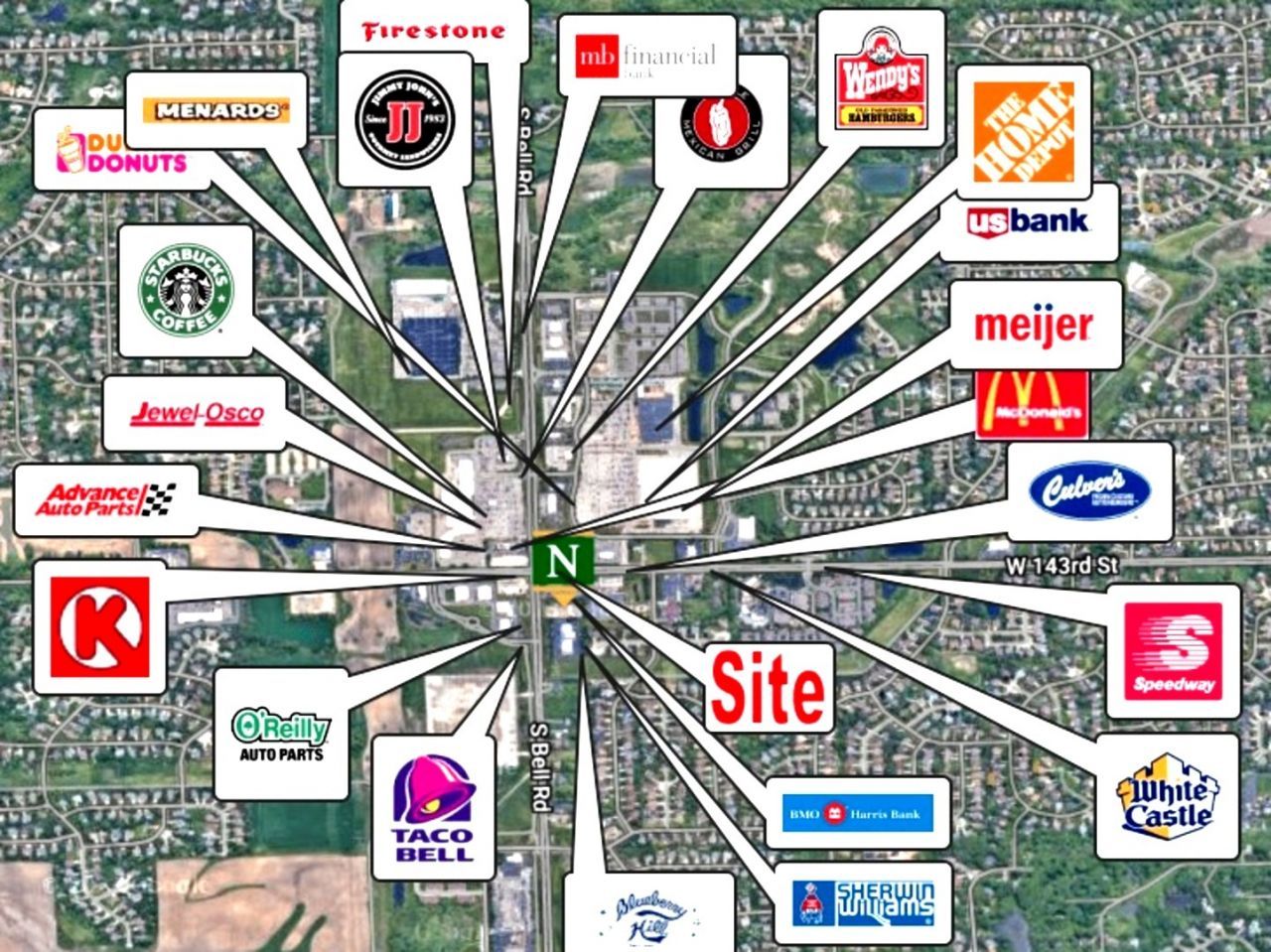 Available +/-57,420 square foot development site located at 14325 S Bell Rd., Homer Glen, IL. The site is just off the southeast corner of 143rd St. & Bell Road adjacent to BMO Harris Bank. There is +/-198 sf feet of frontage along Bell Road. The property is available for Ground Lease or will Build-to-Suit for a credit tenant. The site is located in the heart of Homer Glen's shopping and business district. Several big box retailers in the area include Home Depot, Menards, Meijer, Jewel Foods, and many other national and regional operators, which include retail, office, banking & medical. Rarely a vacancy in this busy corridor along 143rd St. that intersects thru the villages of Lemont and Lockport to the west and Orland Park to the east.