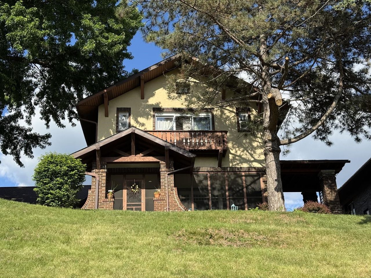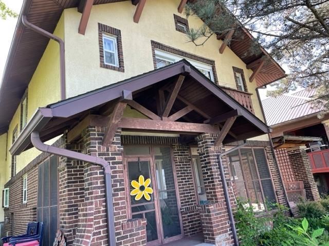 A 2-story Craftsman style brick and stucco home built in 1918 with 3 bedrooms/1.5 baths in Savanna. This home has many updates, 3234 sq feet above grade and is located on a nicely landscaped double corner lot (100x135), set on the bluff with full Mississippi River Views. Adding to the original character, is lead glass, refinished wood-stained trim, and solid wood paneled doors. The wood casement windows on the main floor have original and fully functional hardware. All windows have a storm/screen combination. The roof was replaced in 2007 with new gutters, there is a 200-amp circuit breaker service, an older hot water boiler system, 40-gallon water heater, and a water softener. In 1990, a great room addition (34x24) and a 3-stall built in garage was constructed. In addition, extensive retaining walls were installed as well as a sunken concrete patio. The upper-level bath was completely gutted and remodeled in 2007 with tile flooring, tile tub surround, a custom-made vanity with a hard surface top, and a Jacuzzi tub. There is no finish in the lower level however notes a laundry area with sink, a .5 bath and a ton of storage. A 24x26 addition was added in 2012 with finished 2nd level space and a full basement. It is utilized as an additional family room and a home office. Finish includes Hickory flooring, drywall and painted car siding, wood painted trim, and 70/30 wood double hung windows. The family room walks out to a poured (June 2012) 15x26 concrete patio with a river view. The asphalt driveway facing Madison was replaced with concrete June 2012. Most recently, in 2020 the kitchen was fully remodeled with new cabinetry, counters, plumbing fixtures, microwave, a garbage disposal and a water filtration system. The main level 1/2 bath off the kitchen was also remodeled in 2020 with ship lap walls, new vanity, and fixtures. Also in 2020, the stairs going to the upper level, the hall and 2 bedrooms the wood flooring was refinished, and the master bedroom carpet was replaced 07/2021. The basement windows were all replaced in 2024 and the boiler was replaced in 2025. There is a front screened porch with a covered side porch with full river views, and 2 additional patios for all your entertaining needs.