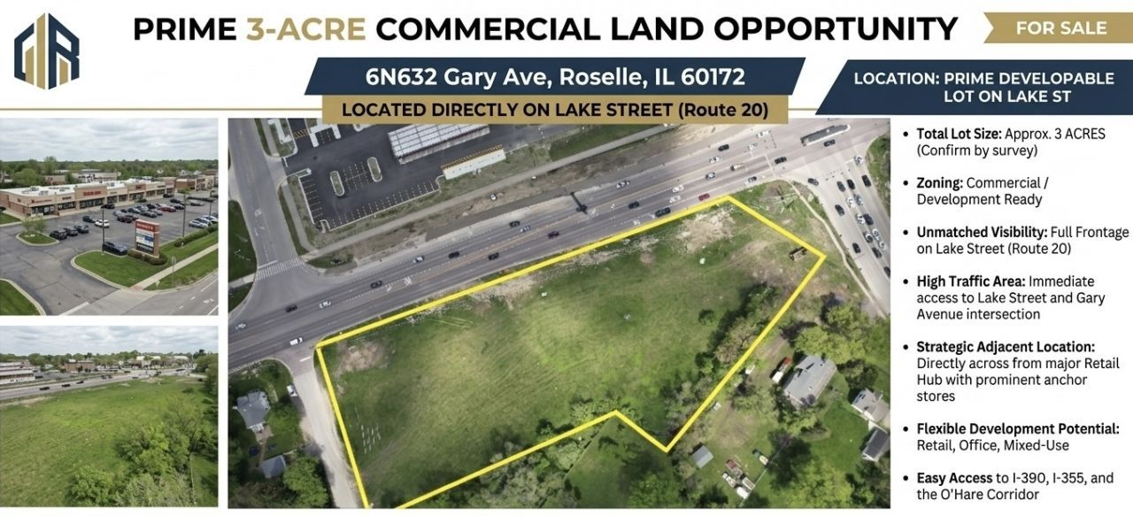 Positioned at the highly visible intersection of two major arterial roads, Lake Street (US Route 20) and Gary Avenue. This provides exposure from multiple directions and excellent branding opportunities. Combined Daily Traffic: With over 70,000 vehicles passing daily (52,300 VPD on Lake St. and 20,400 VPD on Gary Ave.), this site offers significant customer exposure and constant brand reinforcement. (Be precise with these numbers). Ease of Ingress/Egress: The corner location facilitates multiple potential access points, crucial for efficient traffic flow for customers, employees, and deliveries. Size & Flexibility: 3.00 Acres: This generous acreage provides ample space for a substantial commercial development, allowing for diverse concepts, robust parking solutions, and potential future expansion. Development Ready: Ideal for a variety of commercial uses, including retail, quick-service restaurants (QSRs), medical facilities, office buildings, industrial, medical, or a mixed-use development. (Specify permitted uses based on zoning). Strong Local Demographics & Market Dynamics: Established & Growing Community: Roselle and the surrounding area offer a solid demographic base with consistent residential growth and consumer spending power. Proximity to Major Transportation Hubs: Direct access to Elgin O'Hare Expressway via Gary Avenue enhances regional connectivity and broadens the customer base. This is a significant draw for businesses reliant on wider market reach. Complementary Surrounding Businesses: (Mention any nearby successful retail, restaurants, or services that draw traffic to the area). Investment & Value Proposition: High Demand Location: Properties at signalized, high-traffic intersections like this are consistently in demand for commercial development due to their inherent marketing advantages. Long-Term Growth Potential: Investing in a prime corner parcel ensures long-term asset value appreciation within a stable suburban market. Ideal for: Retail Chains: Seeking maximum brand exposure and high customer traffic. QSRs/Restaurants: Capitalizing on drive-by traffic and ease of access. Medical/Urgent Care Facilities: Benefiting from visibility and convenient patient access. Financial Institutions/Service Providers: High visibility builds trust and awareness. Automotive Services: Easy accessibility and high traffic counts are critical. Industrial Use: Multiple uses great for flexibility whether you want office or contractor uses Developers: Looking for a large, well-located parcel with strong development potential. This is an incredibly compelling opportunity at the absolute prime intersection of Lake Street and Gary Avenue in Roselle. With over 70,000 vehicles on Lake Street and over 20,000 on Gary Avenue daily, you're looking at a combined traffic count exceeding 70,000 vehicles that will pass your business every single day. That translates directly into unparalleled visibility and a continuous stream of potential custom